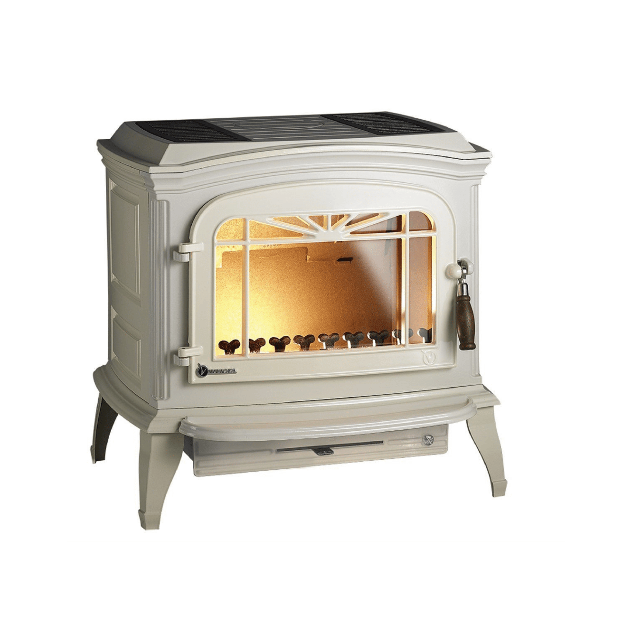 İnce, bu kompakt soba, ateşin geniş bir görünümünü sunar.