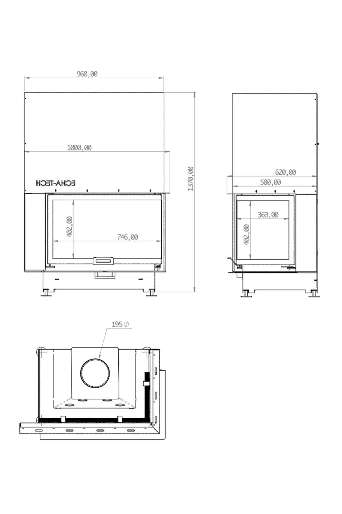 Echa Tech Erhöhter Eckkamin aus Stahl, rechts offen, 90 Nennleistung: 15 kW; Heizleistungsbereich: 8 - 21 kW; Heizeffizienz: 85 %; Material: Stahl; Brennstoffart: Holz; Durchmesser des Kaminauslasses: 200 mm; Rauchgastemperatur: 250 °C; Maximale Holzlänge: 70 cm. ; Gewicht: 280 kg; Stein: Vermiculit; Garantie: 5 Jahre;