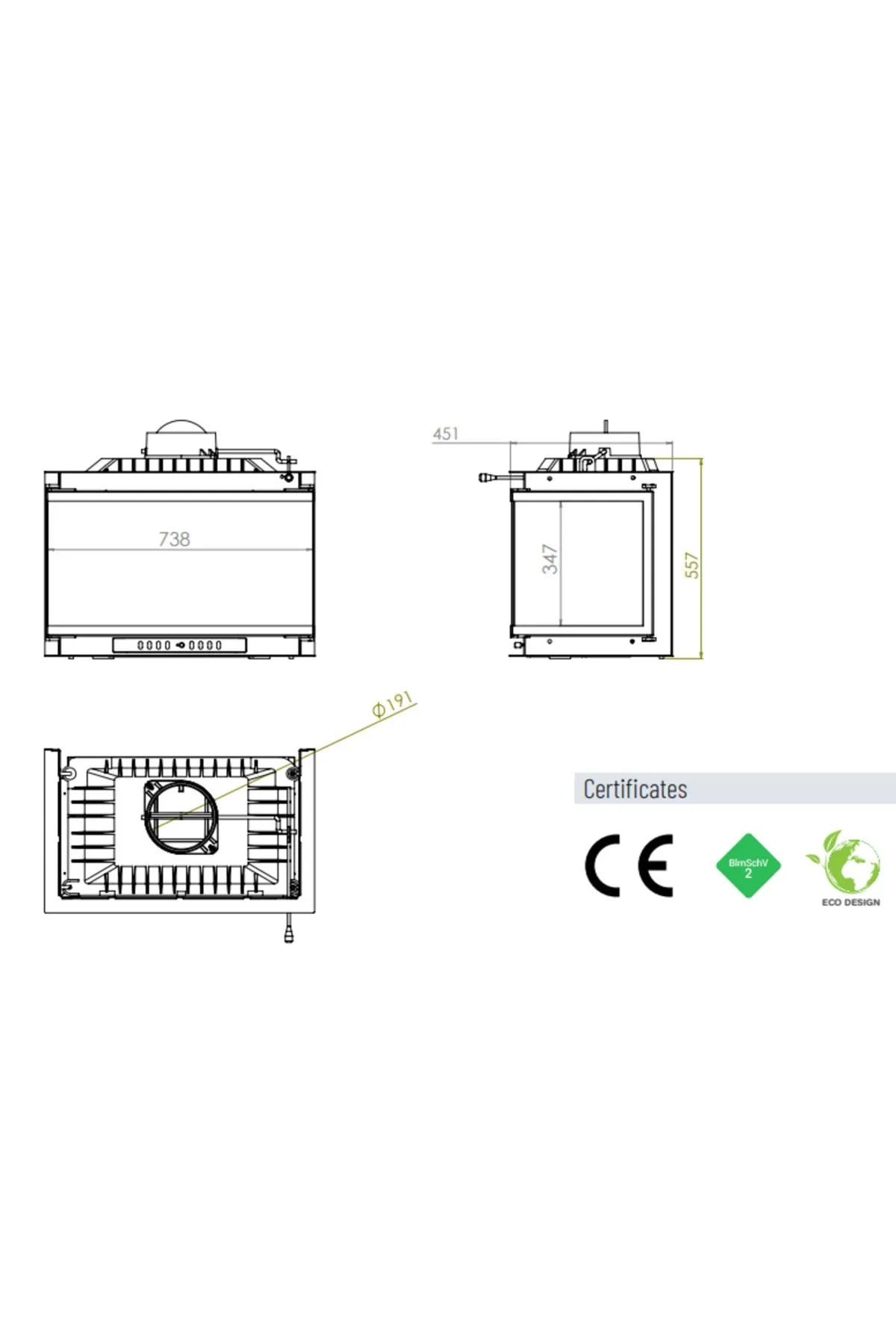 Genişlik : 738 mm ; Yükseklik : 557 mm ; Derinlik : 451 mm ; Baca Çapı : 200 mm ; Ağırlık : 130 kg ; Malzeme :Döküm ; Nominal Çıkış : 14 kw ; Isıtma Gücü Aralığı : 7 - 20 kw ; Verimlilik : % 85 ; Cam : Seramik cam ;